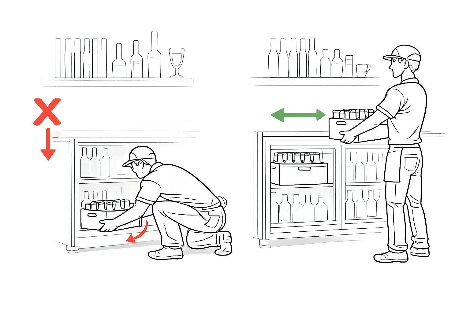 Manual handling is a key part of day-to-day operations in bars and pubs, particularly when restocking bottle fridges. Repetitive movements such as lifting, crouching, and twisting can place significant strain on staff, increasing the risk of injury over time.