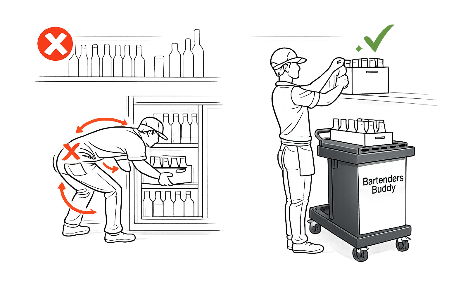 Bartenders Buddy is designed to support safer and more efficient restocking by allowing staff to work at bar height, reducing the need for bending, crouching, and repeated movement.